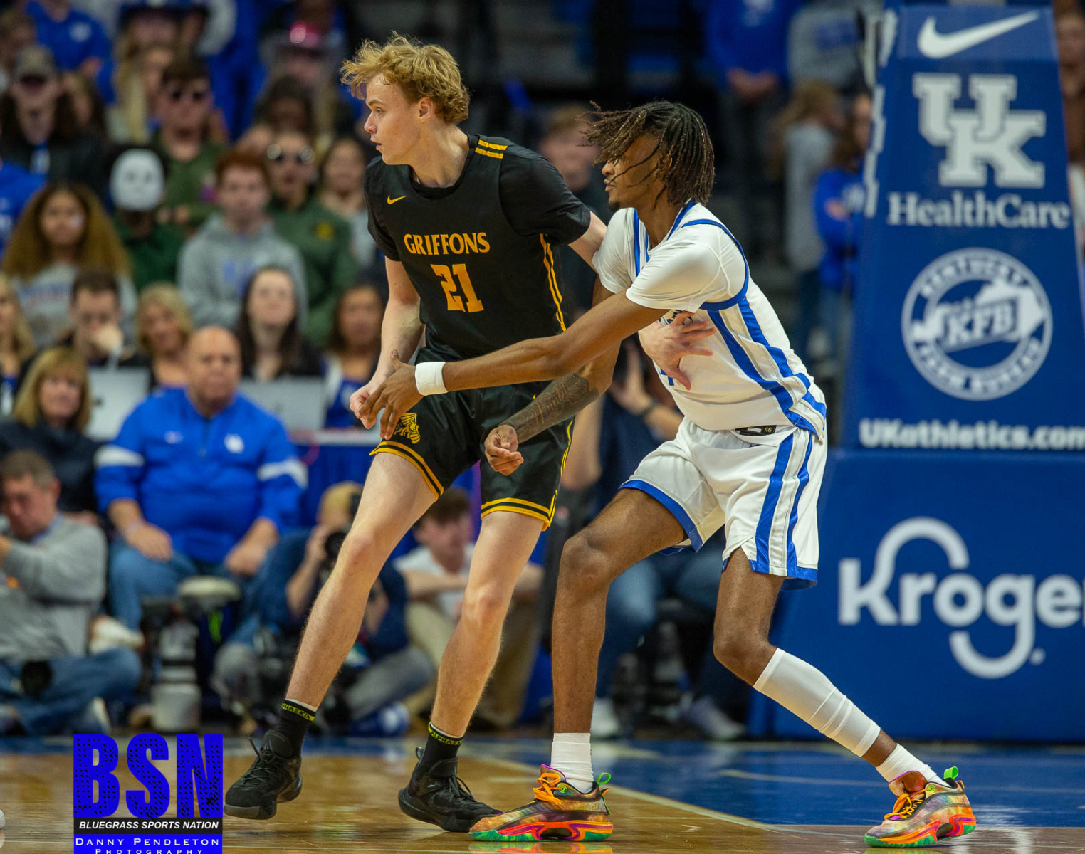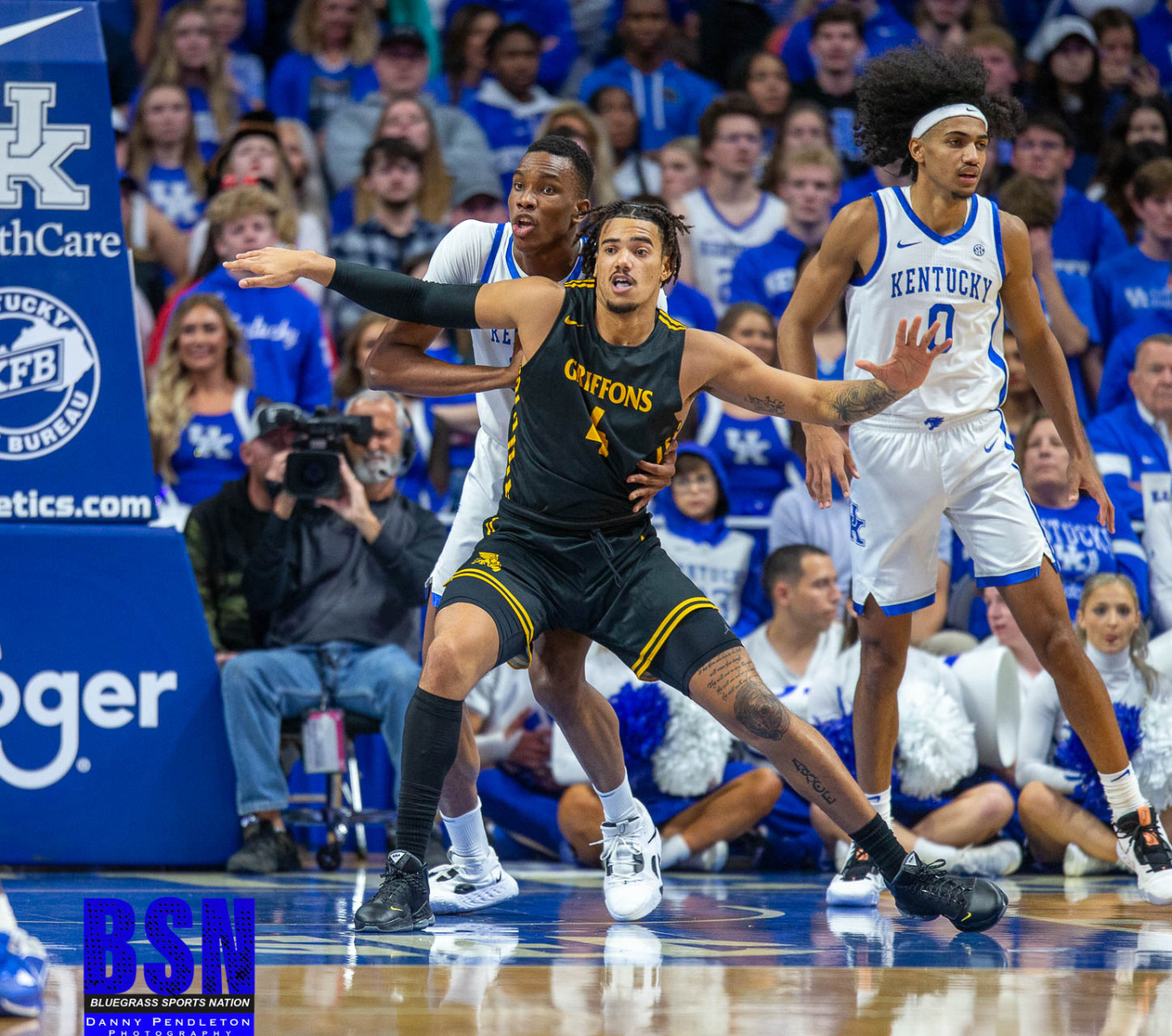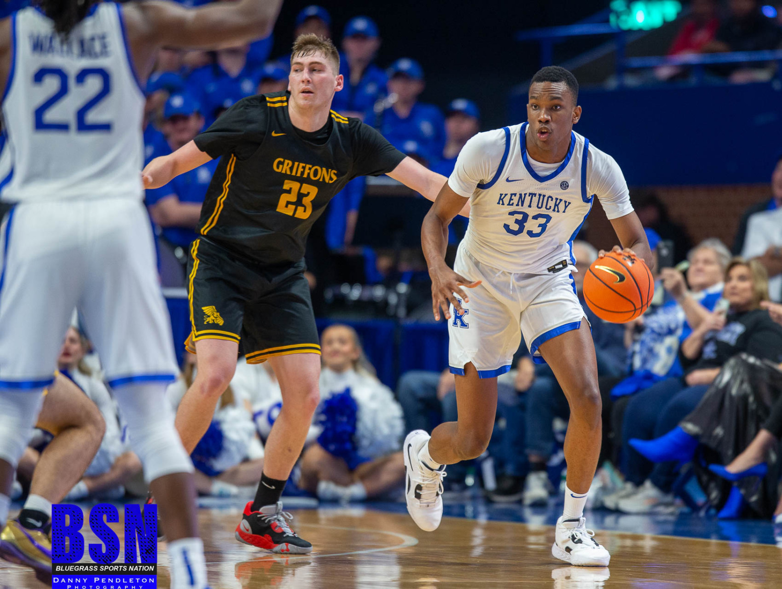 It was a slow start for the Cats who began the second half with 2 turnovers and 1 for 4 shooting. The score was 29 to 20 at the first media timeout. A 6-minute scoring drought by the Griffins kept the Cats in the lead. Halfway through the second half Sahvir Wheeler was fouled driving to the basket and left the court with a leg injury. The Cats were able to finally pull away from the Griffins late in the second half due to Cason Wallace and Adou Thiero scoring.