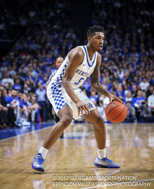 After taking an early 9-0 lead, the Wildcats watched as both of their starting guards Malik Monk and DeAaron Fox had to leave the game with two fouls each, less than four minutes into the contest.  With Monk and Fox on the sidelines the Commodores went on a 15-6 run, so blow-out adverted, game on.  The rest of the game was a close contested affair.  With the Wildcats struggling to get their composure, Coach Calipari went away from his normal tendency to keep a player on the bench with two fouls until halftime.  He re-inserted Monk back into the game at the 12:00 mark and Fox rejoined the game with 9:00 minutes to go in the half.  It was a risk the UK coach decided to take in order to regain control of the game.