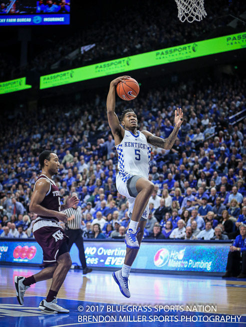 After taking an early 9-0 lead, the Wildcats watched as both of their starting guards Malik Monk and DeAaron Fox had to leave the game with two fouls each, less than four minutes into the contest.  With Monk and Fox on the sidelines the Commodores went on a 15-6 run, so blow-out adverted, game on.  The rest of the game was a close contested affair.  With the Wildcats struggling to get their composure, Coach Calipari went away from his normal tendency to keep a player on the bench with two fouls until halftime.  He re-inserted Monk back into the game at the 12:00 mark and Fox rejoined the game with 9:00 minutes to go in the half.  It was a risk the UK coach decided to take in order to regain control of the game.
